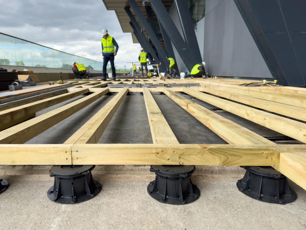 All decking areas were supported using the Buzon DPH pedestal system, chosen for its built-in slope correction, high load capacity, and ability to elevate the deck above essential services. This was particularly important for the promenade, which must accommodate both static and mobile food trucks.